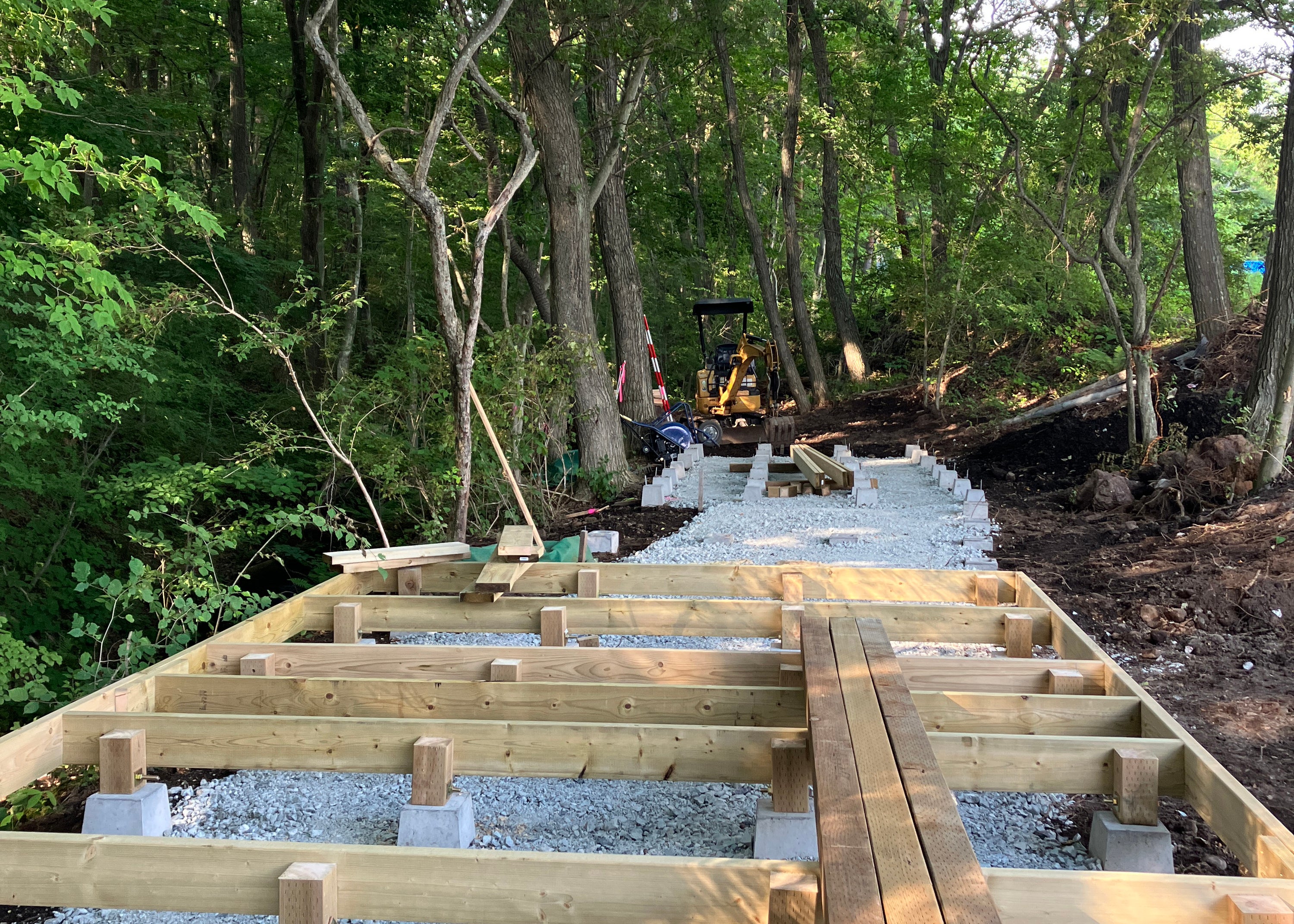 福元はD I Yが盛んなアメリカで育った経験から、長野に移住以降、自宅の増築やリフォーム、車庫建設など様々な経験を積んできました。資金面からサウナ小屋とデッキをD I Yで作ることになりましたが、重機や大きなトラックもなく、本業を抱えながらの工事は難航を極めました。