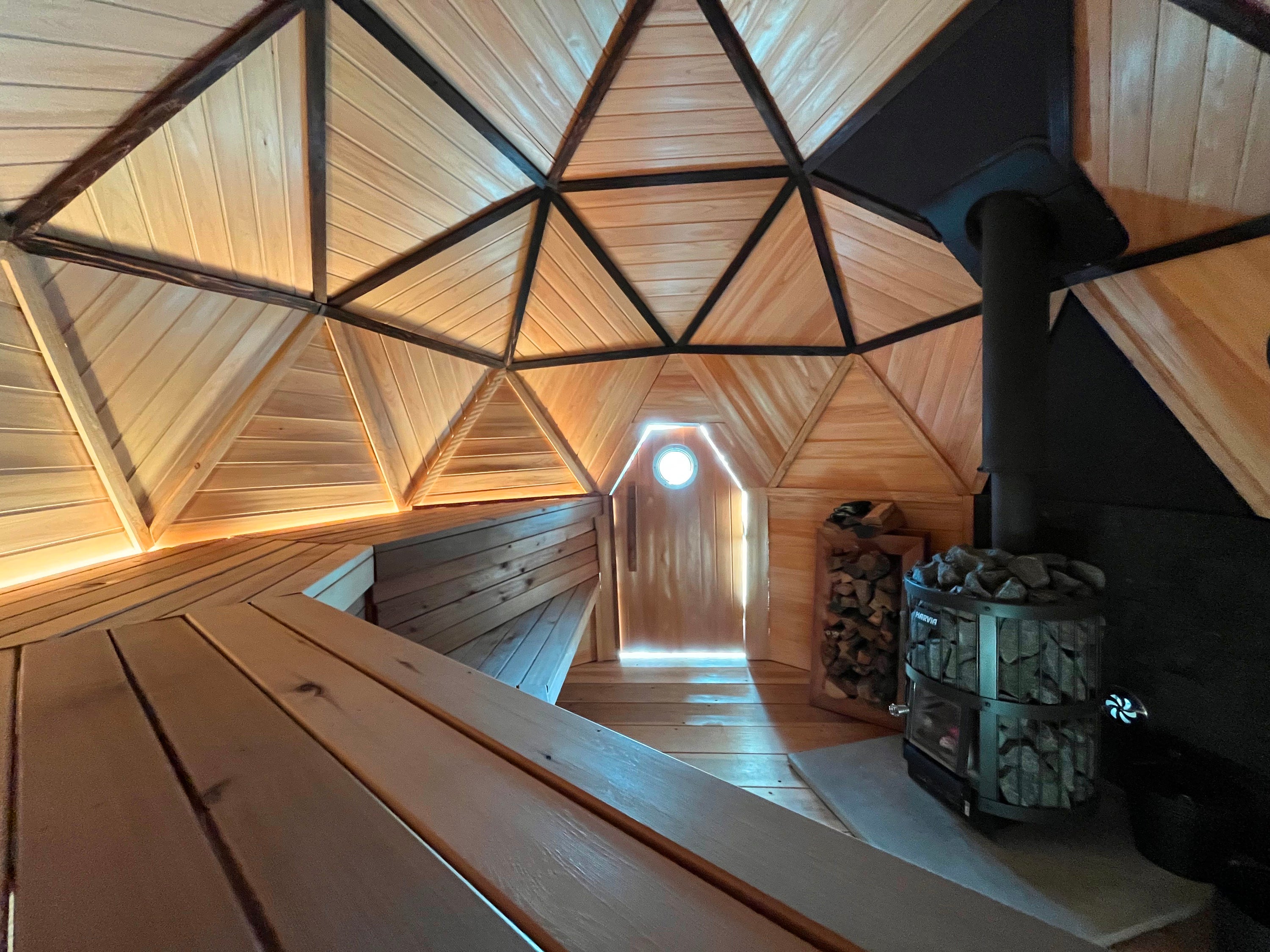 ドームは正三角形と二等辺三角形を多数組み合わせた作りになっており、キットではないのでパーツを全てカットするところから始まりました。組み立て、断熱材詰め、外壁貼りなども三角形それぞれに必要なため工程が多く、多大な時間を要しましたが、唯一無二のサウナとしてカヴェリの看板サウナになっています。